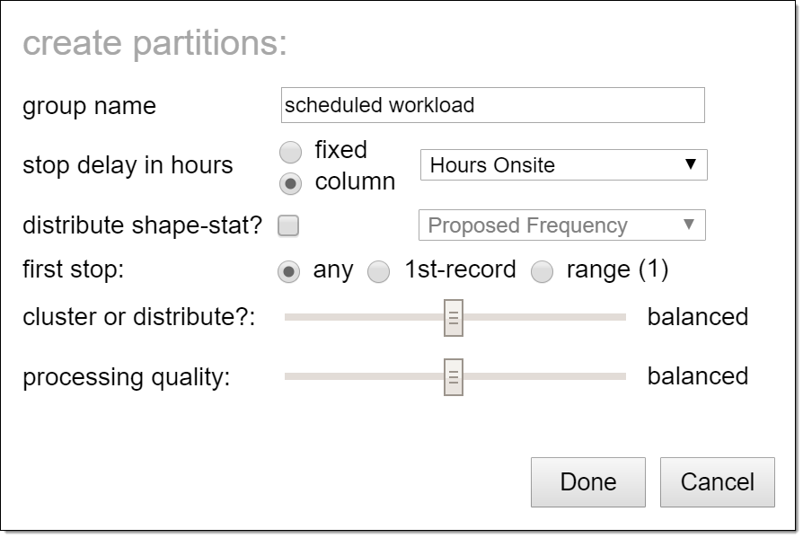 - Cluster or distribute: there is a conflict between isolated workload clusters with minimal drive times and precise distribution of workload between partitions. Set this slider to your preference. *See summary of clustering vs distribute at the bottom of this article.