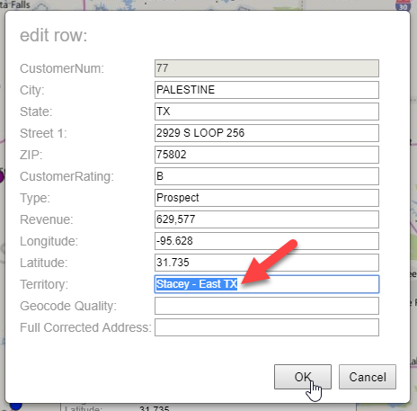 When this is the case, territory realignment must be done differently than in cases where the user is using geographic boundaries. The points themselves must be edited in order to change the territory to which they are assigned. Prior to EasyTerritory’s November release, this needed to be done one at a time by clicking on the point in identify mode and clicking edit: