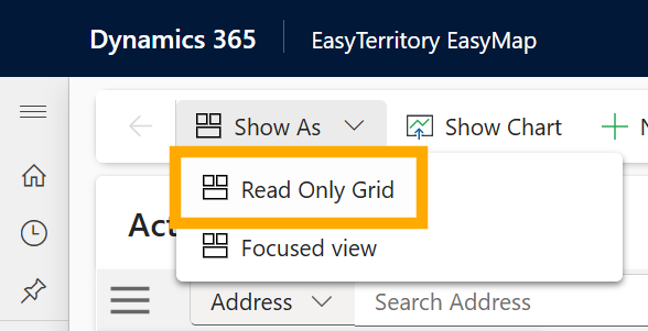 To create a configuration record, go to the upper-left corner of the EasyMap Power App and click the Show as button in the command bar, then select Read-only grid. This opens the grid view, where you can view existing records and create new EasyMap configuration records. See EasyMap Configuration Record Fields for details about each field. After completing the configuration record, click Save and Close.