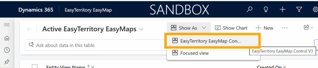 If you have just completed an EasyMaps configuration record, click Save and Close on the record form. After saving, you will be returned to the grid view, where you can see the list of your configuration records. To view the map with your configuration applied, click Show as in the command bar and select EasyTerritory EasyMap Control.