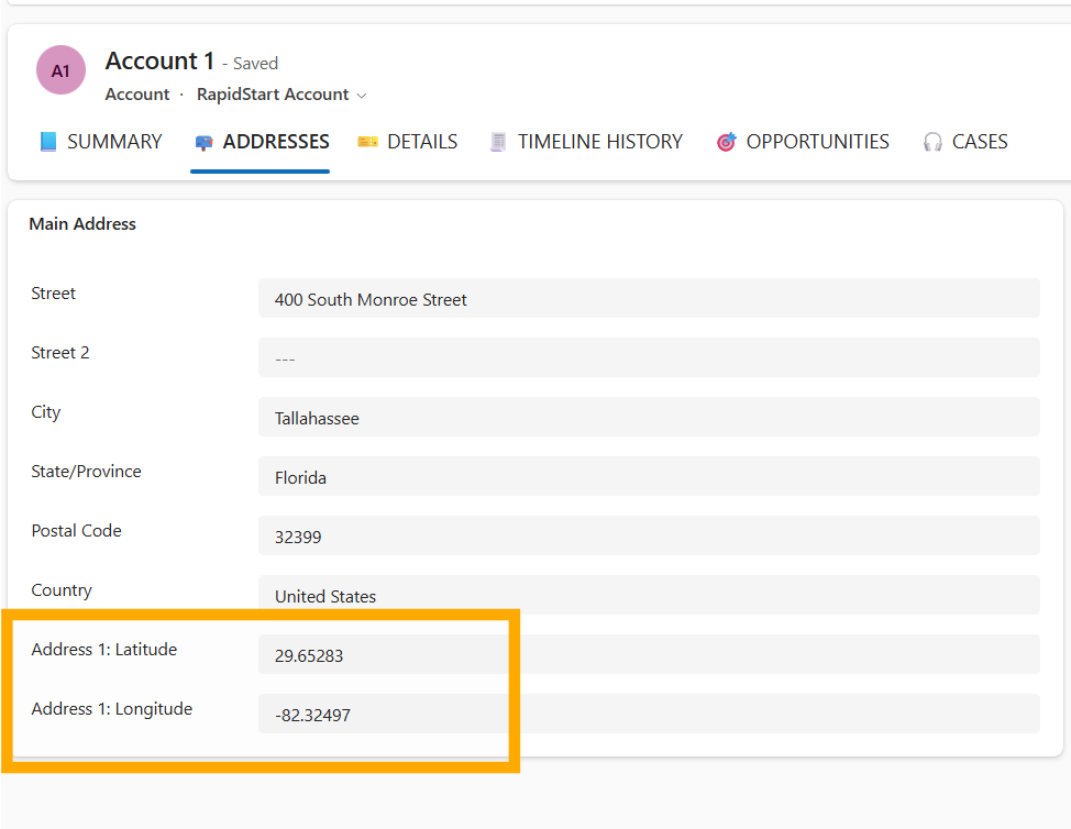 For any entity records you want to display in EasyMap, make sure the Latitude and Longitude fields are filled in. These fields store the location coordinates needed to place each record on the map. You can use the out-of-the-box ‘Address 1: Longitude’ or ‘Address 2: Latitude’ or any custom fields that your organization uses for location coordinates. If your records don’t already have this location information populated, you can use the EasyTerritory Geocode Workflow Plugin to automatically add the latitude and longitude coordinates to your records using Azure Maps.