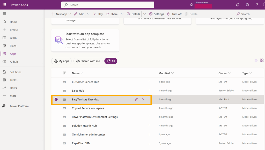 In Power Apps Maker Portal, navigate to the environment where you installed the EasyTerritory solution. In the left navigation menu, select Apps. On the Apps page, choose All Apps. Locate EasyTerritory EasyMap in the list, then hover over the row—a ▷ play icon will appear. Click that icon to open the EasyMap model driven app.