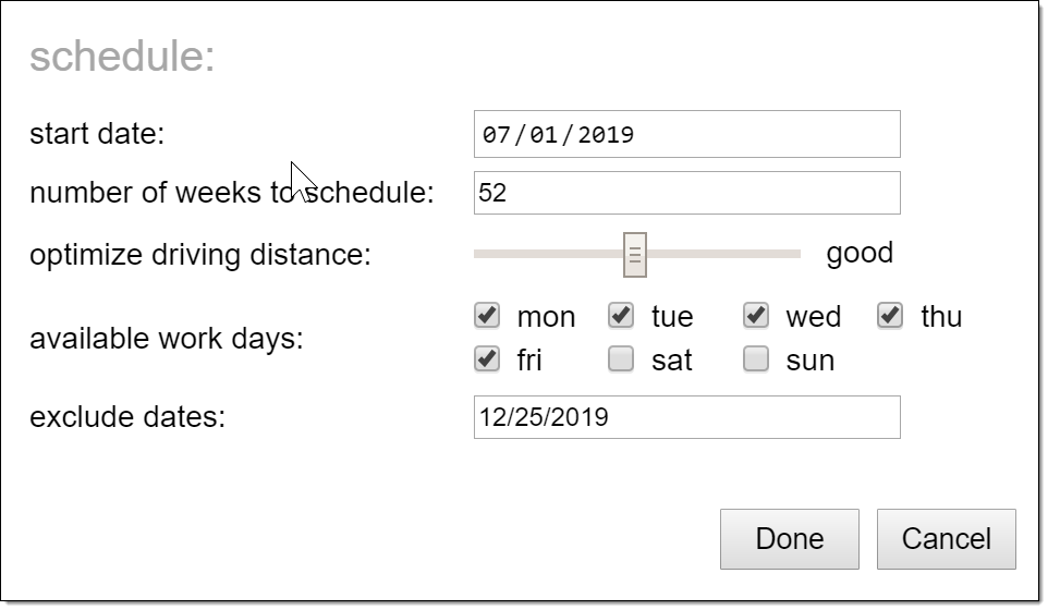 - Optimize driving distance – there is always a conflict between minimum driving distance per day and the deviation between daily workloads and accuracy of the gap between repeat visits. If you set the slider to the left (fair) then the daily workloads will be as similar (minimum deviation) as possible; also, subsequent visits (say every 4 weeks) will be a close as possible. However, your reps will have to drive further. If you set the slider to the right (best) then driving distances will be minimized, but at the expense of fluctuation in daily workloads and variation in the frequency of visits (e.g. if a visit is every 4 weeks it might schedule the next at 3.5 weeks out).