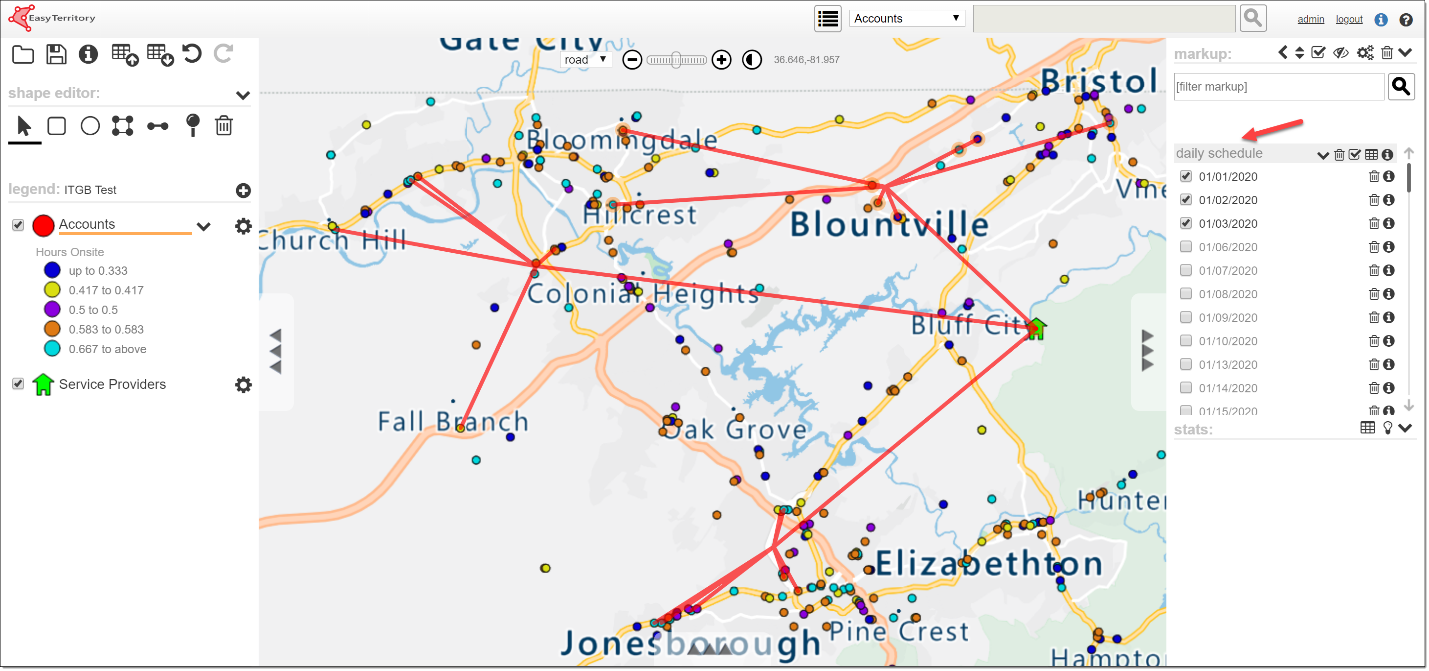 With the introduction of EasyTerritory version 3.5x, scheduling is now more versatile and flexible than ever. Scheduling provides planners a way to group sites (accounts, customers, etc.) into daily partitions across a scheduled period. Scheduling takes into account multiple factors making it a powerful planning tool: