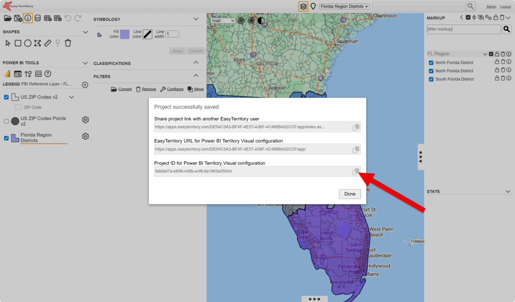 Step 6: After saving, copy the “Project ID for Power BI Territory Visual configuration” and click “Done”.