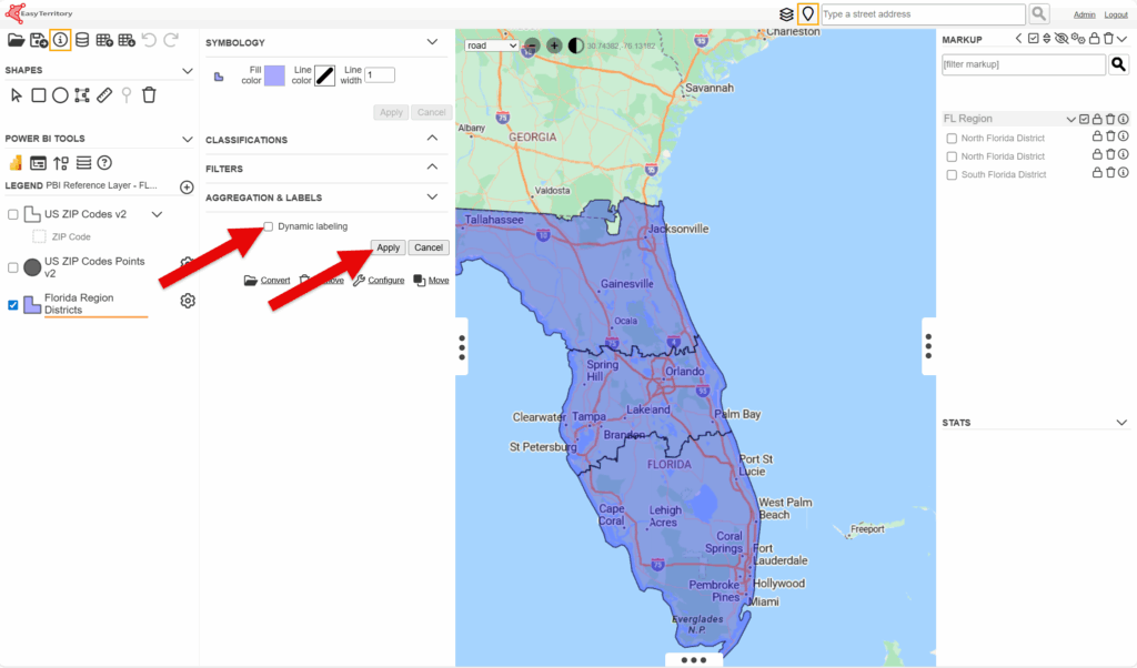 - Optionally: to display the labels, go to the EasyTerritory Web Application and in the layer, select the gear icon next to the your reference layer. This will open the settings panel. Next, click the configure button.