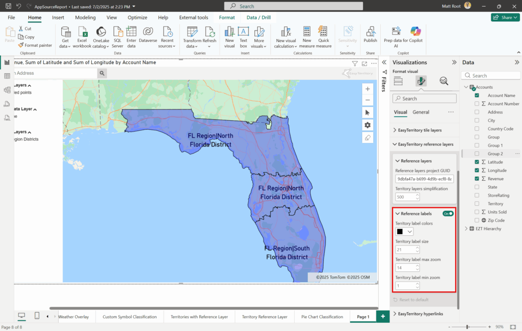 - Go back to your Power BI report and go to the EasyTerritory Visual. In the format panel, under the Reference layers section, turn on the reference labels (screen shot below) and configure the following settings: