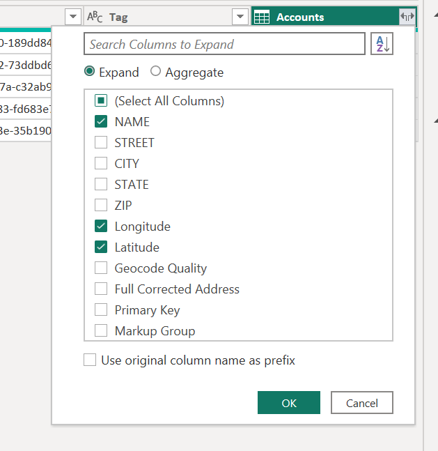Finally, after merging the tables, expand the record column and select the unique identifier, latitude, and longitude columns from the record table. Optionally, you can include any additional columns.