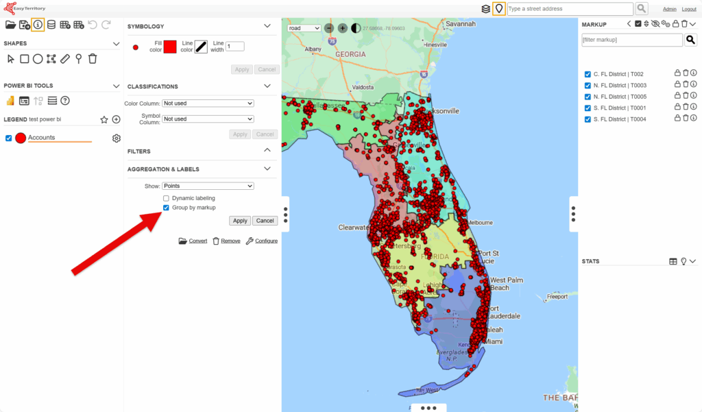 In the Layer Legend, next to your record data layer (e.g., “Accounts”), select the gear icon. Under Aggregation & Labels, enable Group by markup, then click Apply.