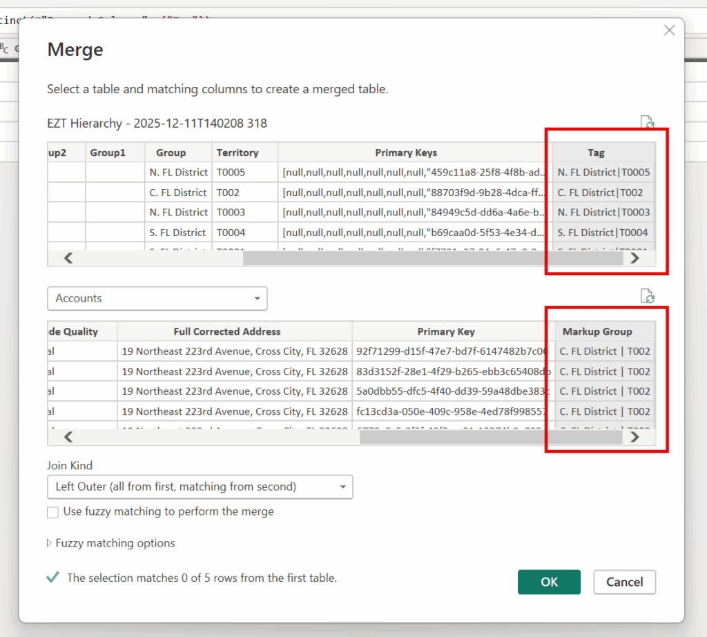 In the Power Query Editor ribbon, select Merge Queries. In the Merge dialog, match the Tag column from the EZT Hierarchy table with the Markup Group column from your record table.