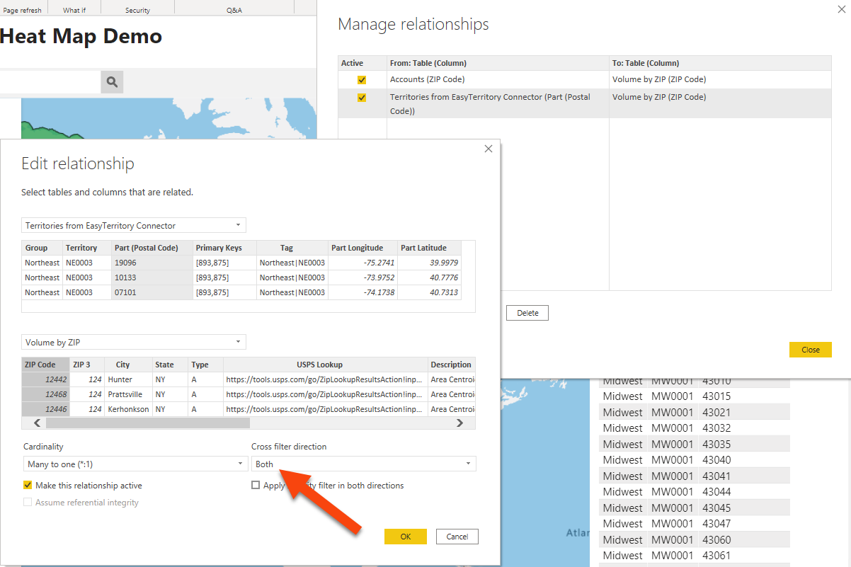 If you are trying to display fields in the tooltip from a table other than the ‘EZT Hierarchy’ table, make sure have correctly configured the relationship between your related table and the ‘EZT Hierarchy’ table. To do this, go to Power BI toolbar and under ‘Modeling’, select ‘Manage relationships’. In the ‘Edit relationship’ dialog confirm that you have highlighted the correct related fields in both tables and selected the correct ‘cardinality’ for your specific use case. Most times you will need to set the ‘Cross filter directions‘ to ‘both’. Lastly, make sure the ‘Make relationship active’ checkbox is selected.